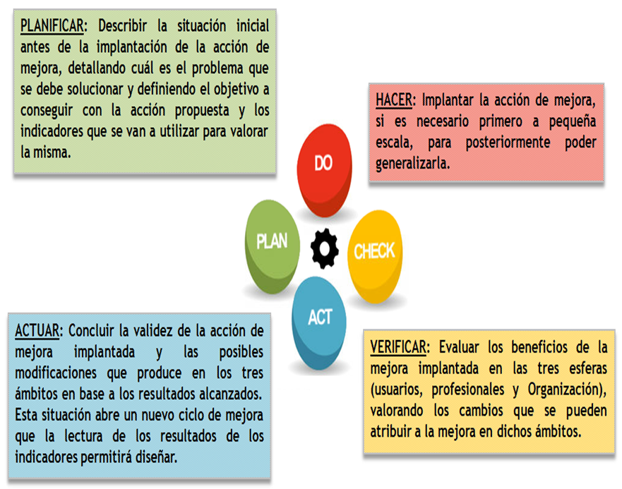 Metodología y desarrollo de la Evaluación de seguimientoEl centro hospitalario debe seleccionar aquellas acciones de mejora que quiera abordar siguiendo la metodología que se describe a continuación: -Plan de Evaluación de seguimiento GECA: en él se establece una revisión anual de las fichas de acción de mejora que los hospitales quieran proponer para valoración por la UEC-SESPA a partir de su primera Evaluación GECA, a lo que se añade una visita de seguimiento de las mismas cuando sea necesario para su análisis o para comprobar el grado de implantación de las mismas. -Jornadas de evaluación: anualmente se procederá al estudio y valoración de las acciones de mejora, además de aquella documentación que el centro nos remita en anexo para justificar el soporte a las iniciativas. Además, dependiendo del alcance de la acción de mejora, se realizará una visita de monitorización cuya finalidad será verificar que la documentación que da soporte a las acciones de mejora propuestas se corresponde con un nivel de implantación y alcance adecuados. -Criterios de valoración: Cada ficha de la acción de mejora y la documentación con ella relacionada serán valoradas en base al cumplimiento de los criterios descritos en los apartados que conforman las distintas fases del ciclo PDCA y que se pueden consultar con detalle en esta misma página web en el anexo 3 del documento completo "Evaluación de seguimiento". Salidas de la Evaluación de seguimiento-Equipos directivos de los centros hospitalarios. Las conclusiones de este proceso se reflejarán en un informe que relacione las acciones de mejora remitidas, su comparación con los criterios establecidos y la valoración que de ellas se haga. -Dirección Gerencia del SESPA. Anualmente se realizará un informe de cierre de ejercicio GECA, que recoja todas las acciones de mejora valoradas tras su implementación en cada uno de los hospitales de la Red del Principado de Asturias. -Evaluación comparativa sobre experiencias y buenas prácticas para el progreso en la calidad asistencial de la Red Hospitalaria del Principado de Asturias: Con carácter anual, la UEC-SESPA organizará unas jornadas de benchmarking para dar a conocer acciones de mejora destacadas que puedan ser adoptadas por otros centros.