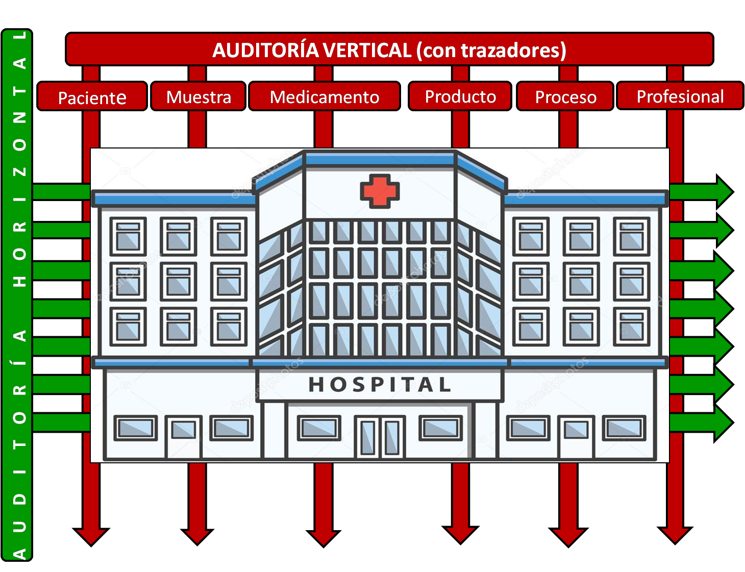 El incorporar la utilización de elementos trazadores permite utilizar otra sistemática para la recogida de evidencias y complementar la auditoría tradicional; se denomina auditoría vertical frente a la tradicional auditoría horizontal. Auditoría horizontal vs auditoría vertical La UEC-SESPA durante sus evaluaciones utiliza seis elementos trazadores: